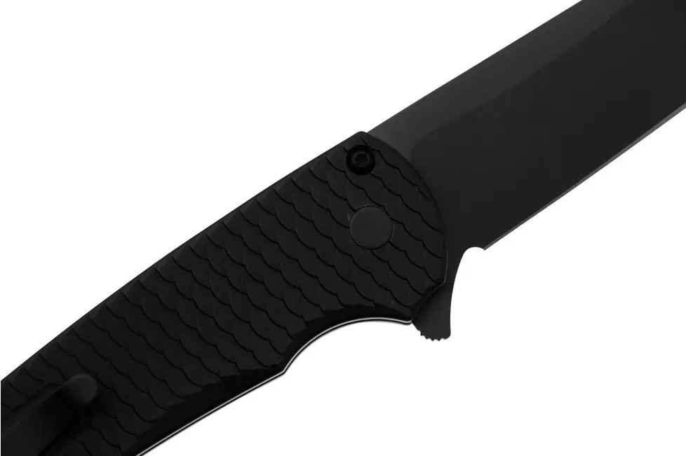 The handle is made of lightweight aluminium with a Dragon Scale texture to provide good grip. The construction of the handle is also worth mentioning. It consists of two milled scales which connect to the spine of the handle. So no separate backspacer or stand-offs. This significantly reduces the number of parts and gives the knife a sleek look.